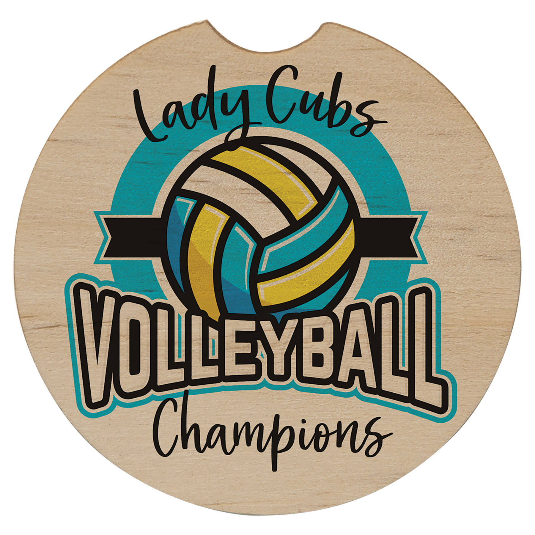 Round wood car coaster can be personalized in full color. Has a finger notch for easy removal from cup holder. Can be sublimated on one side.