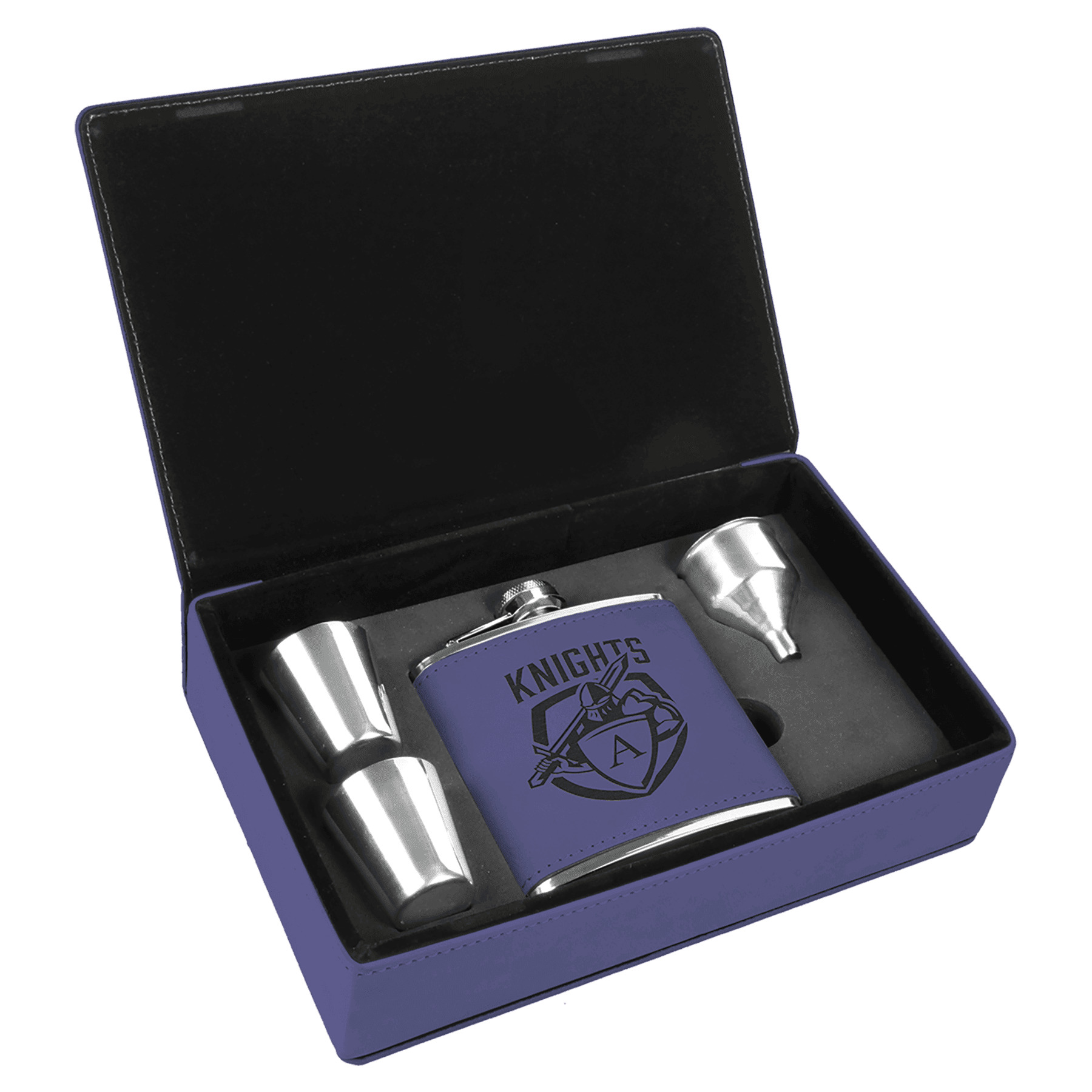 This Laserable Leatherette Flask Gift Set offers the look and feel of genuine leather at a fraction of the price. The material is easy to clean and durable for long lasting beauty and years of use. The set includes the flask, a funnel for filling, and 2 shot glasses. Personalize by laser engraving for bold contrast or UV print for full color to create a great gift, incentive, or promotional item.