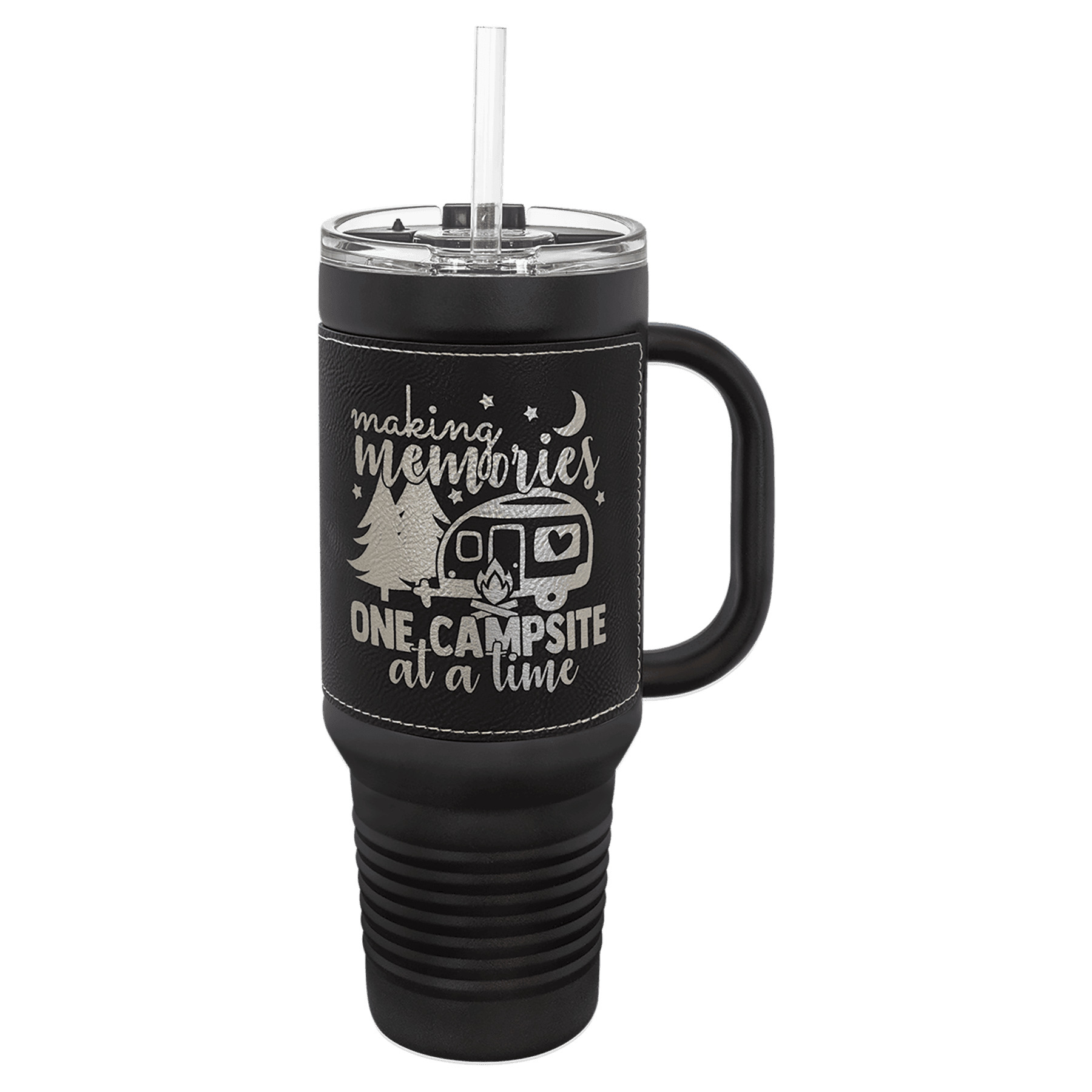 The same high endurance drinkware that Polar Camel has become known for is now available in a 40 oz. Travel Mug with a handle, straw included. This black powder coated mug is wrapped in Laserable Leatherette with several stunning colors available. They’re great for personalized gifts, usable awards, souvenirs, and fundraisers!
